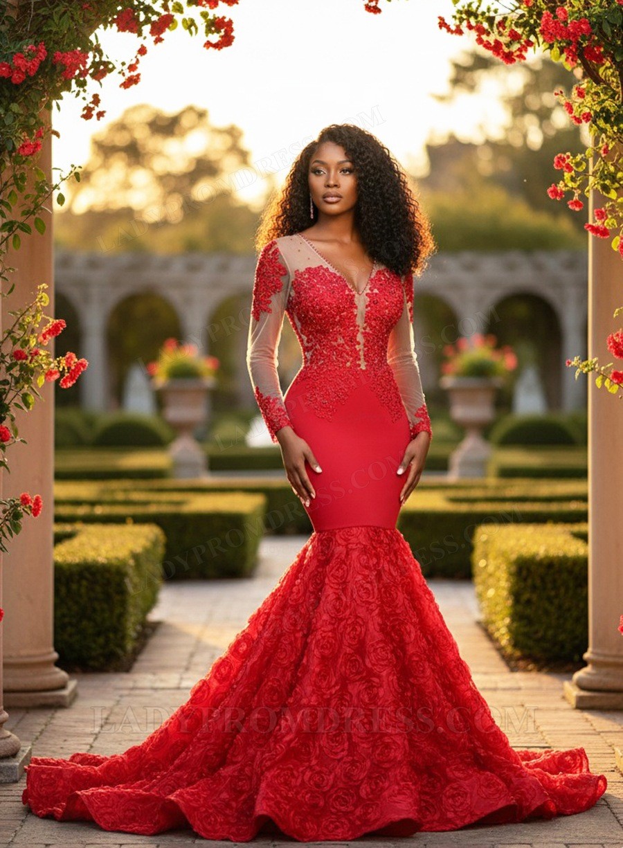 Red Trumpet Mermaid V-neck Long Sleeves Lace Prom Dress with Appliques Zipper Back Sweep Brush Train 2026