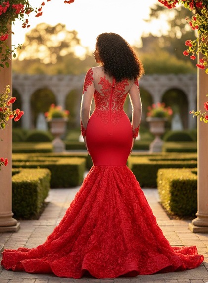 Red V neck long sleeve mermaid lace prom dress with train  SKU:26PD-23428